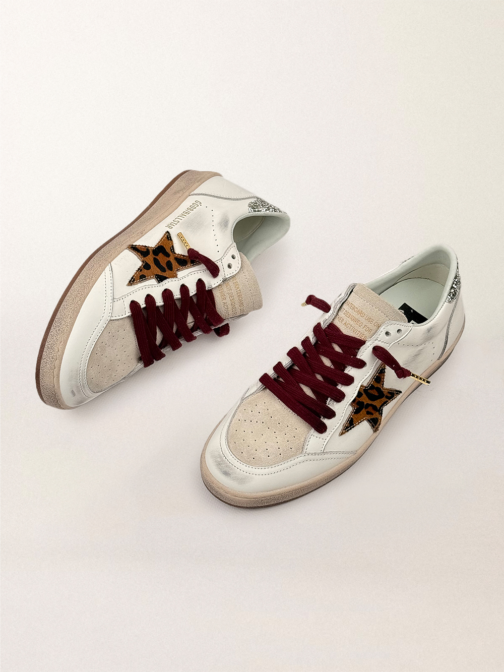 Эта модель из белой кожи наппа с замшевыми вставками на мыске и язычке украшена фирменной звездой из меха пони с леопардовым принтом и серебристым задником. Шнурки контрастного бордового цвета добавляют завершающий штрих: красивые вещи, которые никогда не выходят из моды.