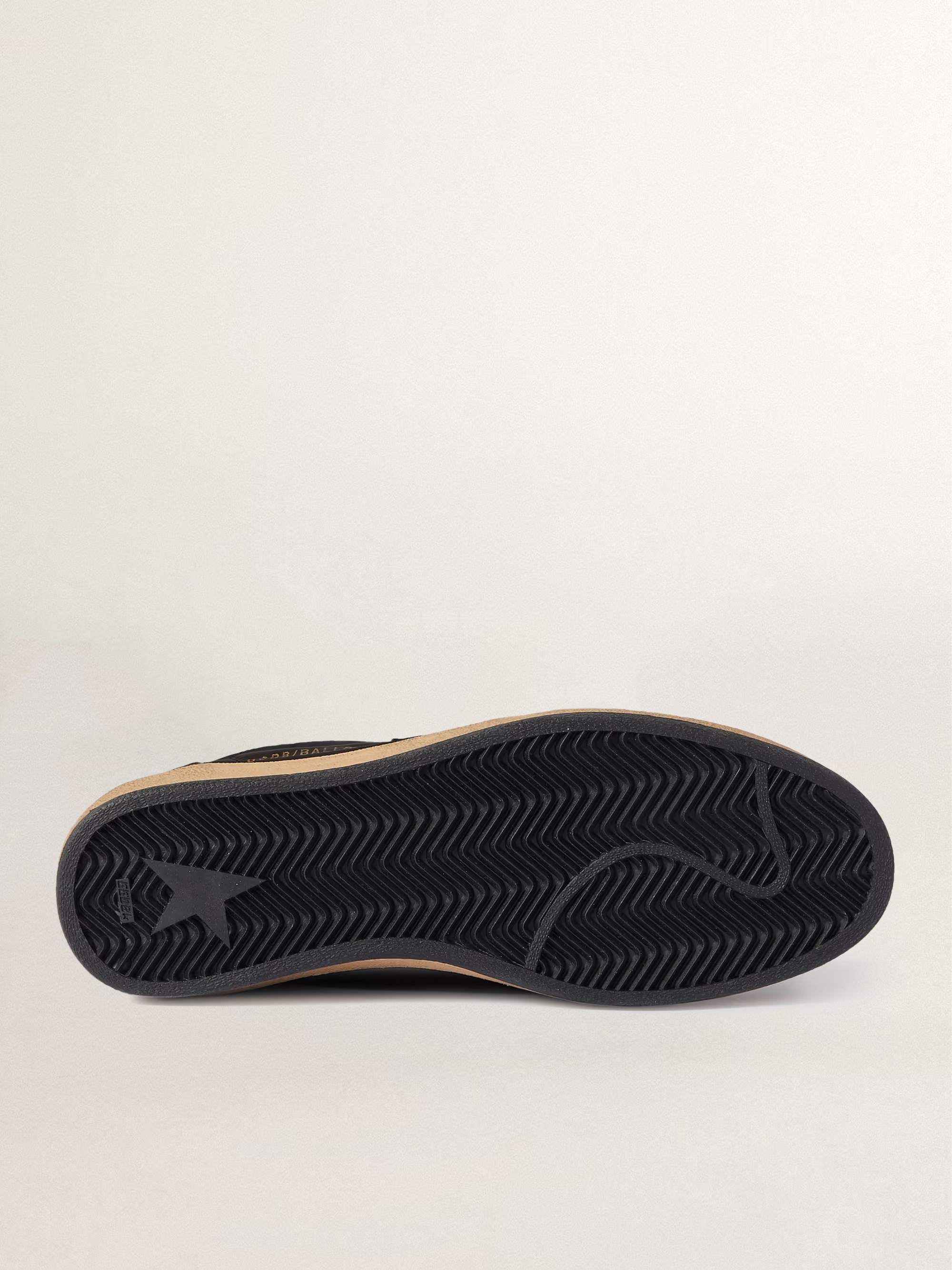 Эта мужская модель с верхом из нейлона украшена черной кожаной звездой и черной накладкой на каблуке из кожи наппа. Серо-ледяные шнурки добавляют завершающий штрих.