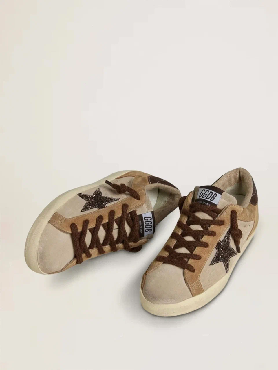 Эти женские кеды Super Star из бежевой и коричневой замши с темно-коричневой глиттерной звездой. Завершающий штрих - коричневые шнурки.