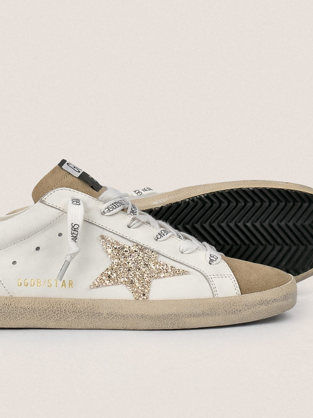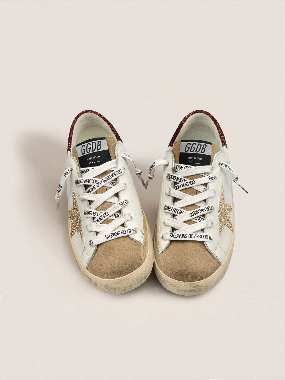 Эти кроссовки Super-Star выполнены из белой кожи и замши бежевого цвета украшены золотистой блестящей звездочкой и бордовой блестящей вставкой на пятке. Завершают образ белые шнурки с контрастным чёрным логотипом.